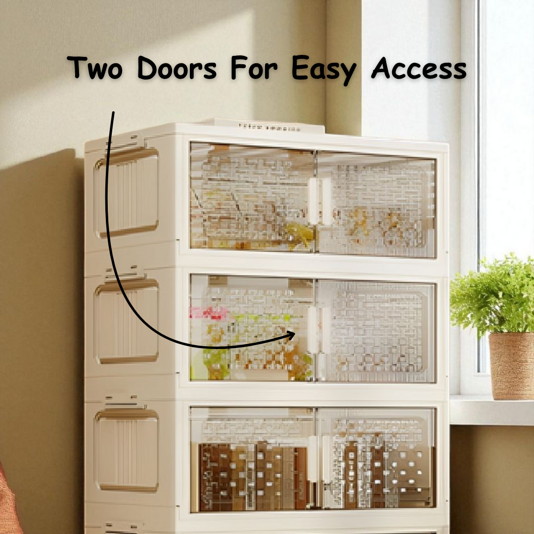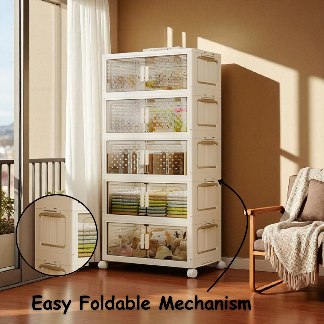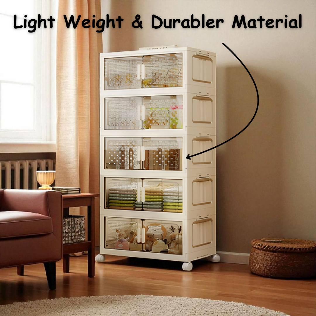 Each of the five spacious tiers is enclosed by transparent dual doors, allowing easy visibility and quick access to stored items. Built with a foldable structure, this unit is lightweight yet durable, making it easy to move, store, or repurpose. The smooth-rolling wheels at the base provide excellent mobility without compromising on stability.