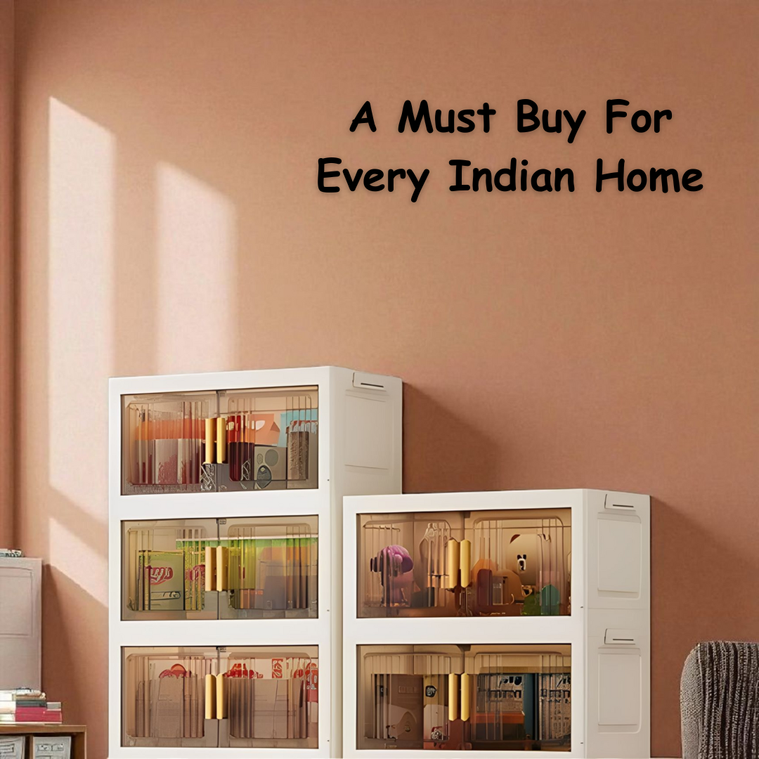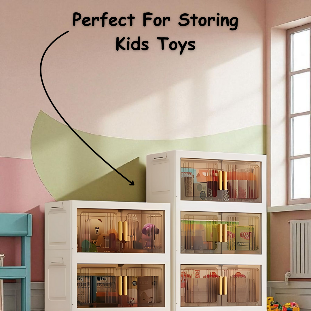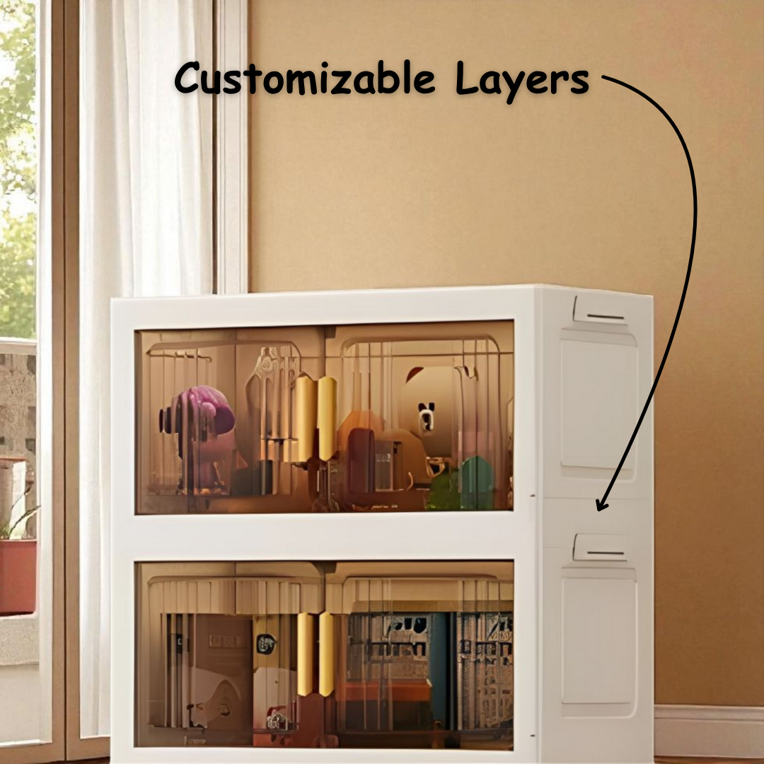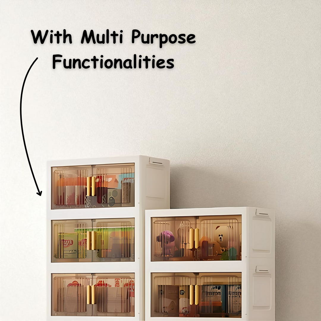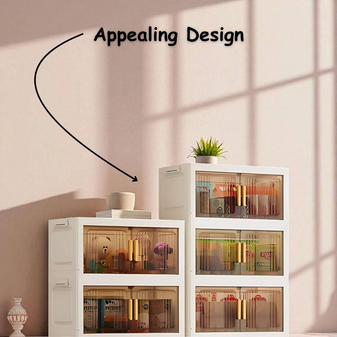 Crafted with a modern aesthetic, this foldable two-door container fits seamlessly into any decor style. The dual translucent doors with gold handles add a touch of luxury, while giving you a clear view of what’s inside. It’s available in stackable 2-tier or 3-tier options, making it a modular masterpiece for any corner of your home.